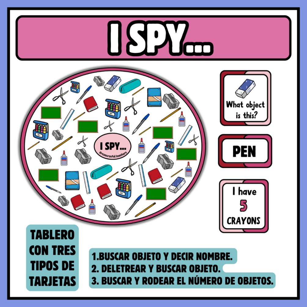 • I spy... 3 tipos de cartas para trabajar vocabulario, spelling and counting.