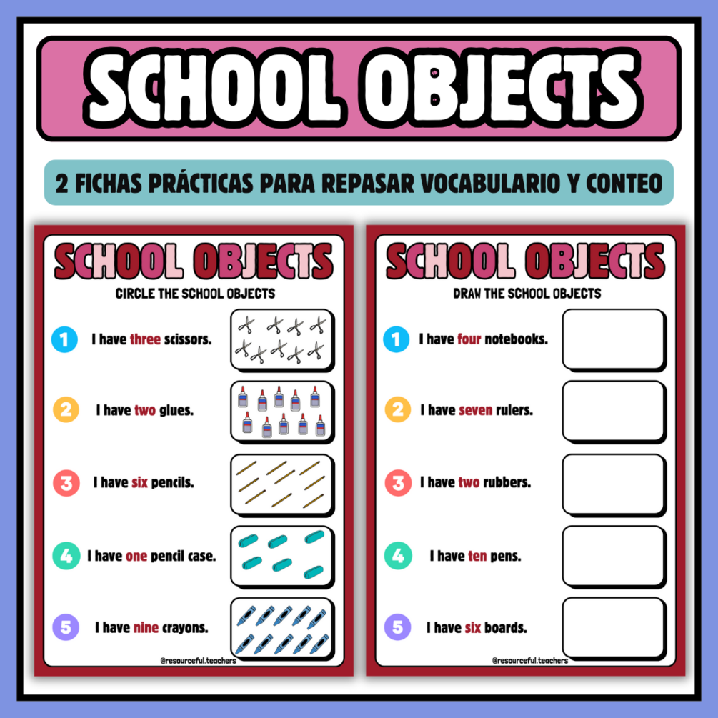 - 2 fichas prácticas para repasar vocabulario y conteo con objetos del colegio.